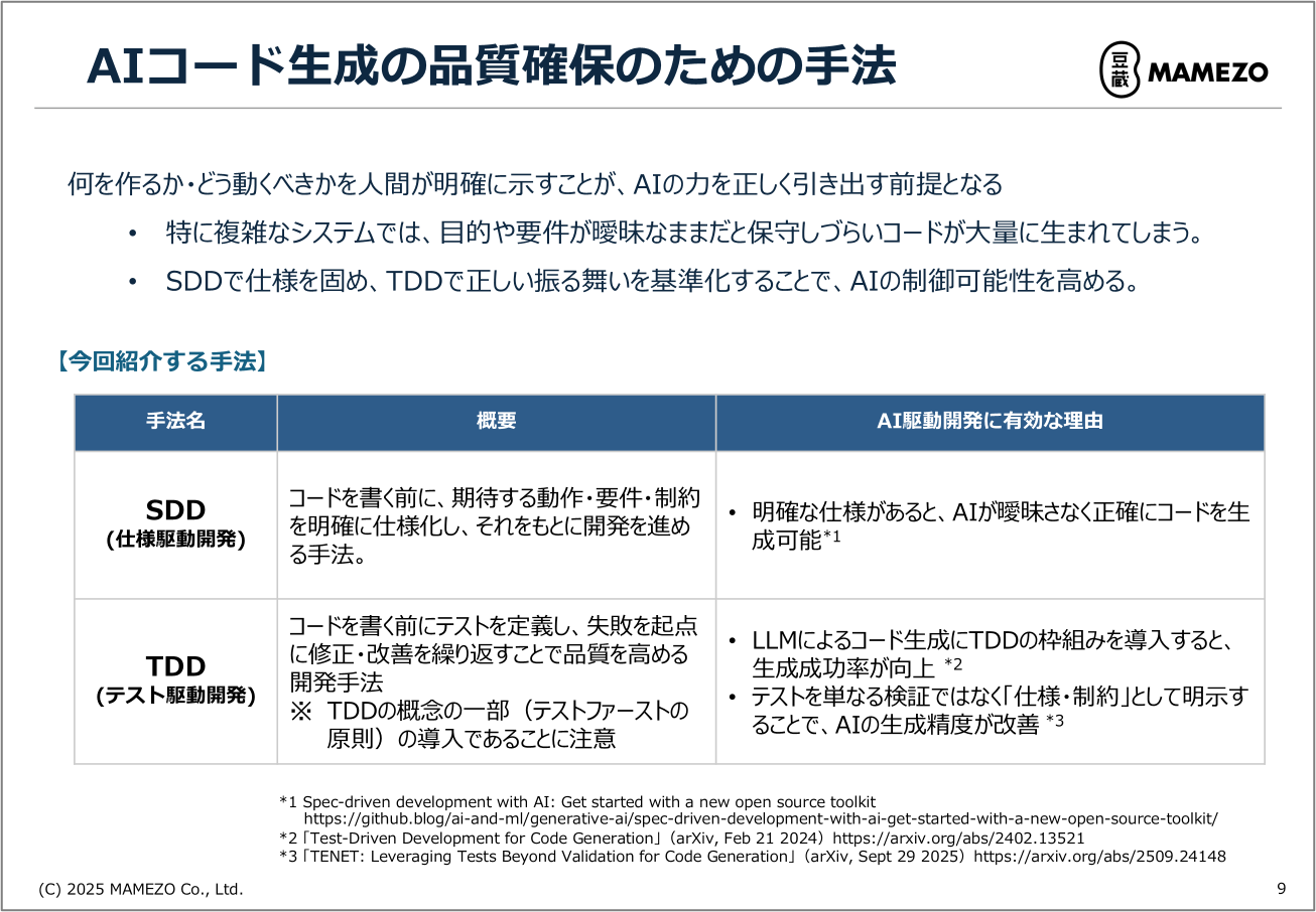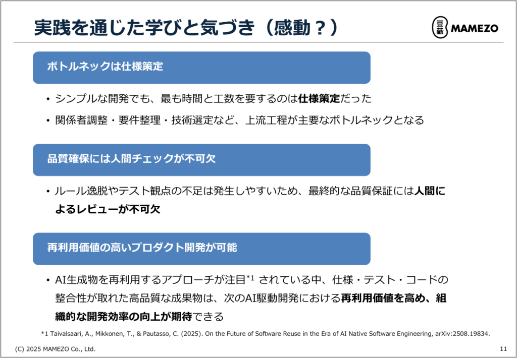 実際にやってみるとその手応えは想像以上で、まず初めてみるのことの大切さが強調されていました。豆蔵では、AI駆動開発 / 導入支援サービス を用意していますので、お気軽にご相談ください。