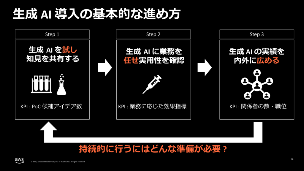 企業には、途中で息切れしない対策と長期的な視点での準備が重要になるとのことです。持続的に生成 AI を活用していくための 3 つステップとその準備は、示唆に富んだ内容でした。準備をすることで、3ステップのループを継続することが可能になります。