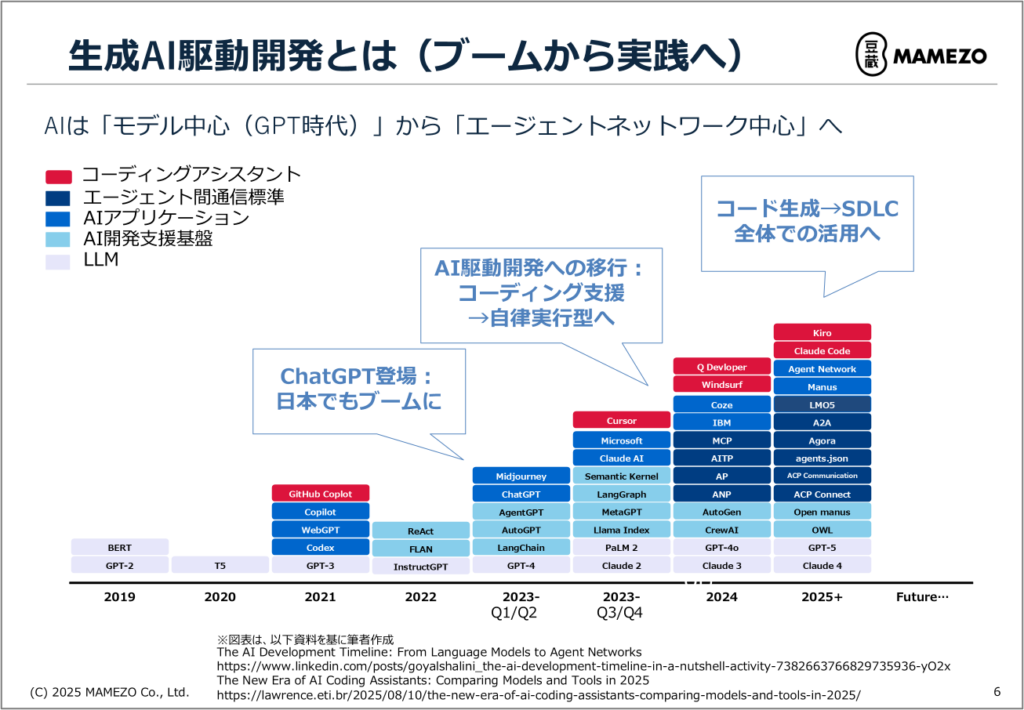 生成AI駆動開発とは、ソフトウェア開発における要件定義、設計、コーディング、テスト、デプロイなどの各工程にAIを活用する開発手法のことです。ChatGPT登場でコーディング支援からブームが始まり、実行までカバーするようになり、2025年現在はソフトウェア開発ライフサイクル全体での一貫した活用へと進化している。